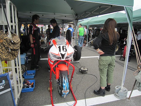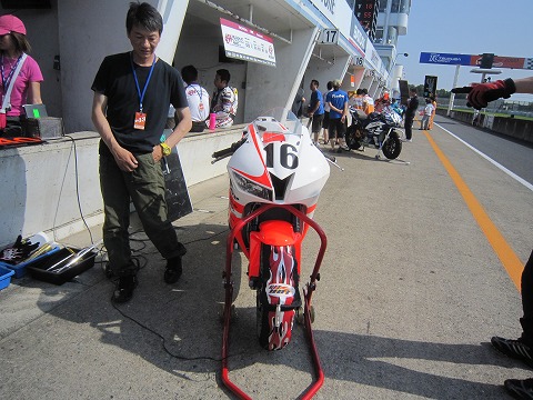 9:28 パドック 駐車場エリアでマシンの準備が出来たら、途中にあるウォーミングアップエリアで暖機をしてインフィールドにあるパドックへ。 ゼッケン#16を貼り付け、いつでも走行できる状態です ここで、予選が始まるまでの間、タイヤを暖めつつ待ちます。 |
