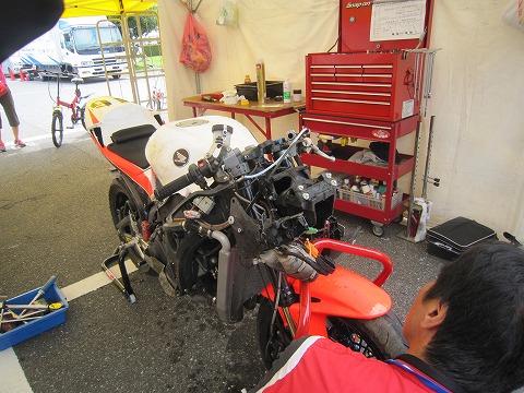 13:10 修理中 只今鋭意修理中。 予選2回目まで修理出来るのがわかったので、ちゃちゃかお昼を食べて修理を進めます。 |