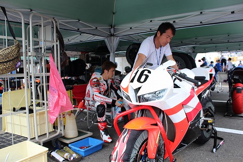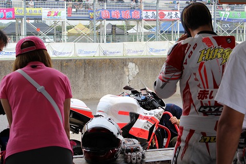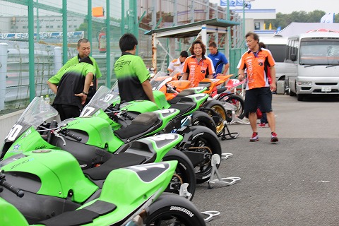 8:18 ピットロードへ J−GP3のウォーミングアップ走行が終わり、マシンがピットロードに移動されました。 20分からの走行に向け、準備を進めます。 |