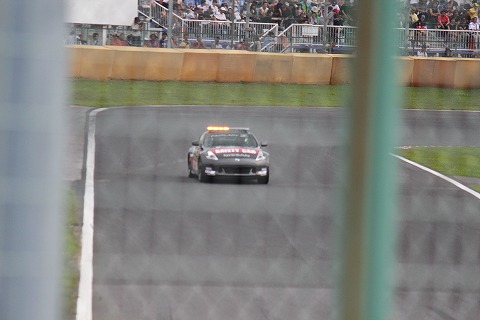 14:30 選手紹介中 JSBの各マシンは既にコースインして、1周のサイティングラップを行い、グリッドに着いています。 各グリッドで選手紹介がされている中、マーシャルカーがコース状況を確認しています。 |