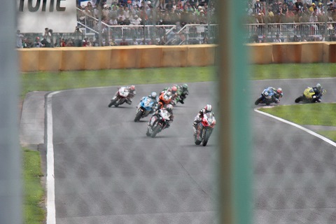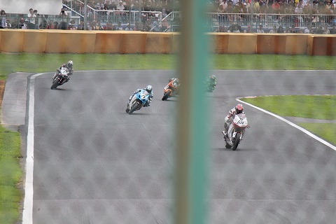 14:39 ウォーミングアップ 選手紹介が終わり、ウォーミングアップ走行が開始されました。 1ヘアピンから勢いよく走ってきたのは#71の加賀山選手。 昨日の予選では5番手に付けるタイム出しています。 この席も、金網があって、写真撮影には向きませんね。(´_`) |