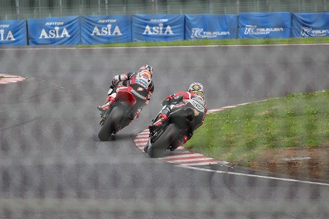 14:46 ASIAコーナーで 1ヘアピンを立ち上がって、ダンロップ下を右にバンクさせ通過。 そのままASIAコーナー(昔のMCコーナー)の1個目を通過していきます。 この角度だと津田選手を完全に射程距離に捕らえている中須賀選手。 ASIAコーナー1個目のゼブラは上に乗っかって通過する選手と、きれいに避けていく選手に別れます。 津田選手は避けていくライン。 中須賀選手は乗っかっていくライン。 自分は乗っかっていくラインです。 理由は何となくかっこよさそうだから。(爆) |