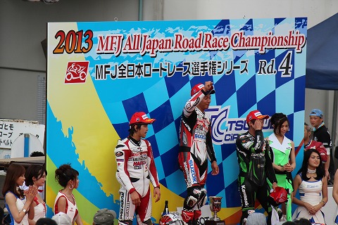 15:25 表彰式 レースが終わった後、メインスタンドまで戻って来ました。 メインストレート上では、今終えたばかりのJSBの表彰式が行われています。 お立ち台の真ん中は、もちろん津田選手。 3位の柳川選手は悔し泣きをしている・・・。のではなく、汗びっしょり。 今日は暑かった。 鈴鹿の8耐も暑いけど、休む暇のない筑波でJSBの30周のレースは流石に応えるみたいだね。(笑) |