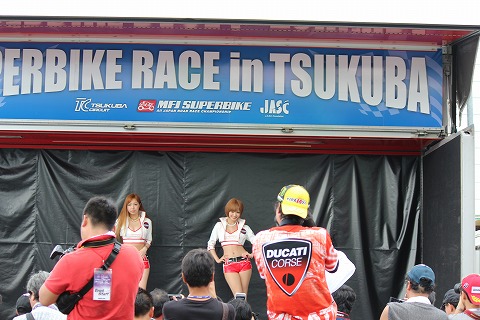 12:48 午後からは 全日本ロードレース選手権 第4戦 筑波。 お昼の時間はピットウォーク。 今回はピットが狭いので、メインストレートも使って開催。 筑波のレースクィーンさんたちもフィニッシュラインに立ってポージングを決めていますね。 午後からは、J-GP2とJSBの決勝です。 |
