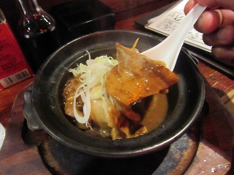 18:50 牛ホルモン煮込み 生ビール2+リッキーを呑んだところで、先に頼んだ3品のつまみがなくなりました。 追加で頼んだのは、モツ煮と迷った末に選んだ”牛ホルモン煮込み”。 お品書きの端に、「数量限定」と書いてあったのに誘われてしまいました。(笑) 牛ホルモンは、プルップルに煮込まれて、いけませんなぁ。 アルコールがが進んじゃいます。(笑) |