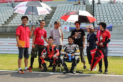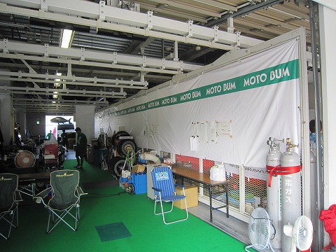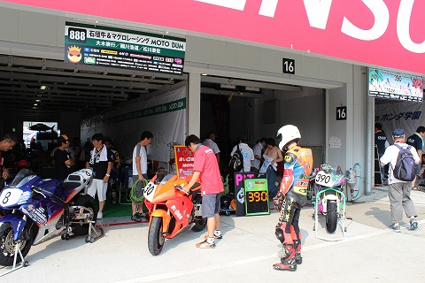 7:35 ピットに到着 駐車場にハイエースを留め置きして、スクーターでサーキットへ。 そして、MOTO BUMさんのピットにやってきました。 今回、國川くんはMOTO BUMさんのチームから走ります。 そして、メカの清水さんも8耐はMOTO BUM さんに合流。 なので、4耐の時間中は4耐チームの赤い3輪車もMOTO BUM さんのピットを間借りしたようです。 |