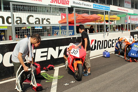 7:47 ピットでは ピットに入ると、清水さんがMOTO BUMの8耐マシンを整備中。 『おはようございま〜す。 今年もお世話になります。』 <(_ _)> |