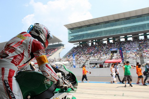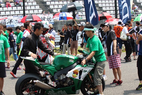 10:53 ピットアウト 10:50、決勝に向けてのスタート進行が始まりました。 スタートライダーとなった國川選手は今ピットアウト! コースを1周、サイティングラップをしてグリッドに向かいます。 |