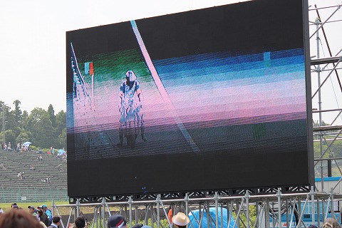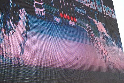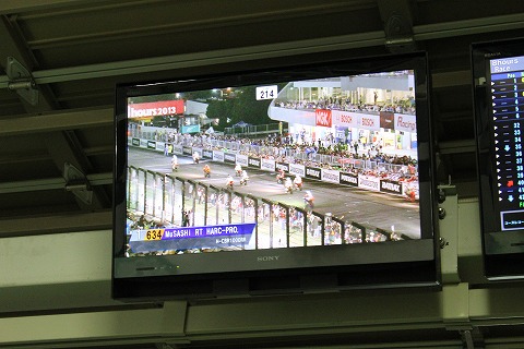 11:30 スタート直前 1〜2コーナーの激感エリアには、1〜2コーナー観客席用のオーロラビジョンが鎮座。 そのオーロラビジョンに映し出されて、スタートの光景。 今まさにスタートが切られようとしています。 |