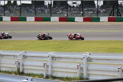 11:39 トップ集団 周回は4周回目 ぐらいかな? ホールショットを奪ったのは、予選2番手からスタートした#12 ヨシムラの津田拓也選手。 2番手は、ポールポジションをゲットした#7 MONSTER YAMAHA。 それに続く3番手は予選5番手からスタートした#99 BMWが続きます。 写真には写っていませんが、その後方には#634 Musashi HARC PROが続いています。 |