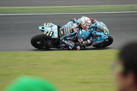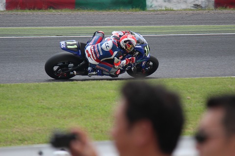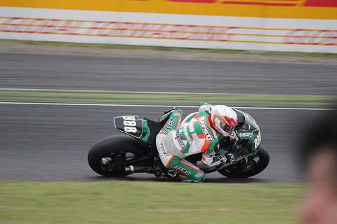 13:39 転倒リタイヤ 激感エリアに居ると場内アナウンスから悲鳴に似た絶叫が! オーロラビジョンを見上げると、トップを走る#11FCC TSRの清成選手がデグナーの先で転倒。 マシンは大破。 コースサイドをゆっくり走行して、ピットに向かう姿が映し出されていました。 清成選手はこのままピットに戻るも、マシンが大破し修復不可能と判断し、リタイヤとなりました。 これで、TSRの3連覇は消えて無くなりました。 |