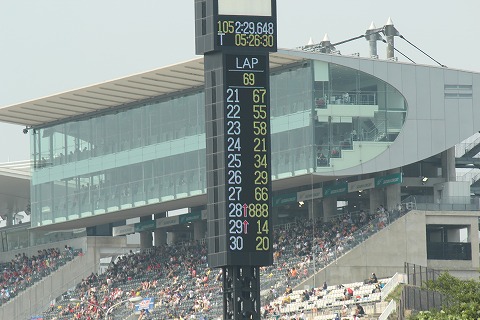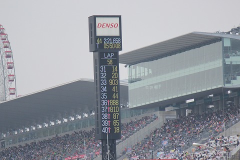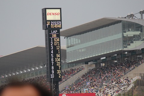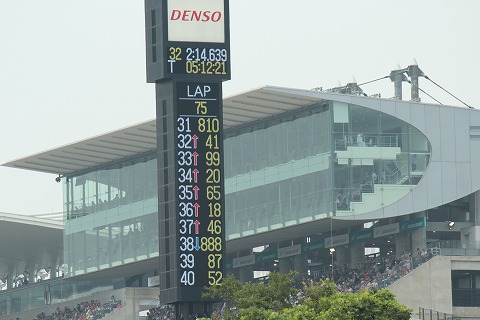 14:18 順位が落ちる! コントロールタワーを見ると順位が38位まで落ちました。 ルーティンのピットインかな? しばらくしても、1〜2コーナーの激感エリアに姿を現しません。 場内アナウンスは他のマシンのエグゾーストノートで聞こえませんでしたが、マシントラブルでピットインしちゃったか、転倒しちゃったみたいです。(>_<) 急いで、ピットに戻ります。 |