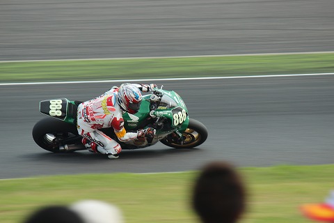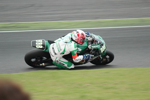 11:30 スタート 11時30分、レッドシグナル消灯で、8時間耐久レースがスタートしました。 ル・マン式でスタートした63台のマシンが1コーナーになだれ込んできました。 スタート直後の混走のなか、やっと見つけた#888。 台数が多くて、何位なんだかバイクの数が数えられません。 シャッターに収めるまでに2コーナーの立ち上がりまで行っちゃったね。 |