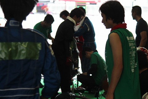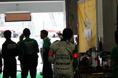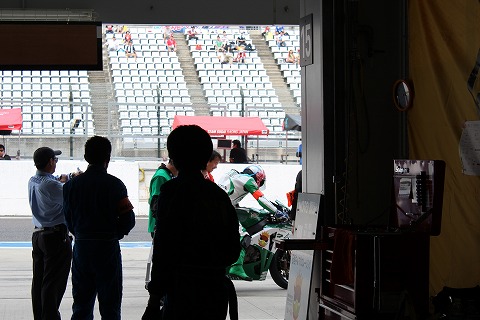 14:23 転倒 ピットに戻ると、マシンが戻っていません。 転倒! 2回目の転倒です。 入ってくる情報が少ないこともあり、ピット内は騒然としています。 國川選手はルーティンのピットインまであと2周の予定だったので、交代予定の大木選手が急いでライディングの準備をしています。 |
