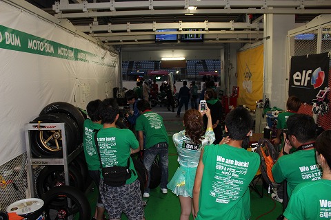 19:37 パレードラン コース上じゃチェッカーを受けたすべてのマシンとライダーがパレードランを行っているのを、ピットのディスプレイが映し出しています。 メインスタンドも、ピットも人だらけで、とても近づくことができません。(笑) |