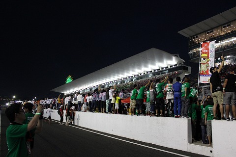 19:30 ゴール! 午後7時30分、8時間耐久レースのチェッカーフラッグが振り下ろされました。 ホームストレートをチェッカーを受けたマシンが次々と通過していきます。 が、ピットウォールに張り付いたピットクルー達でホームストレートを見ることができません。(笑) 無事、チェッカーを受けることができ、ピットクルーは嬉しそうです。 |