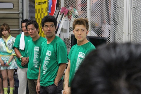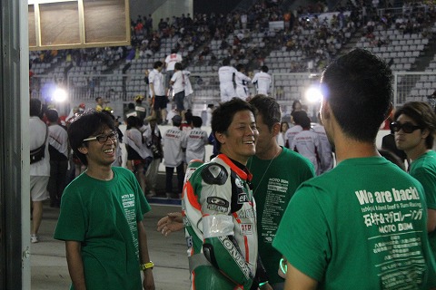 19:54 ライダー達 最後にチームスタッフがピットに全員集合。 ライダー3人も普段着に着替えて、整列です。 國川くんも、一緒にチェッカーに立ち会いたくて、メディカルから戻って来ました。 立っているのもきついみたいで、見ていると結構痛そう。(>_<) |