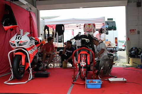 9:29 経過10分 予選が始まって、ボチボチ10分が経過しようとしています。 しかし、マシンはまだピットの中で鎮座。 ライダー國川も現れません。 予選中のピットインに備えて、メカの清水さんが扇風機を準備中。 |