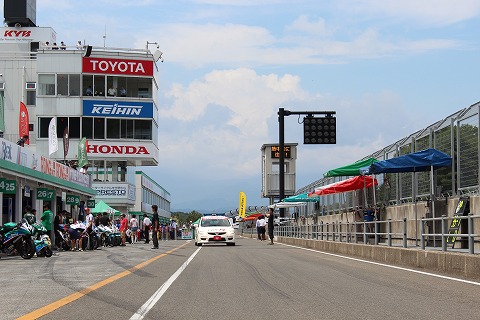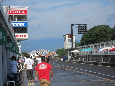 7:01 パドックに到着 ゲートをくぐり、坂道を登りパドックに到着しました。 昨晩雨が降ったようで、パドックの路面はウェット状態です。(>_<) チームは木曜日の晩にサーキット入りして、ピットは既に設営済。 昨日の金曜日にはARTA練習走行を行っています。 |