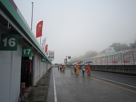 7:03 ピットから ピットのシャッターを開けてピットロードへ。 ピットロードもウェット状態。 そして、最終コーナーの方を見ても霧でDUNLOPブリッジを見ることができません。 今日、ST600クラスの予選は9時20分から行われます。 それまでに晴れて路面が乾いてくれると良いんですが・・・。 |