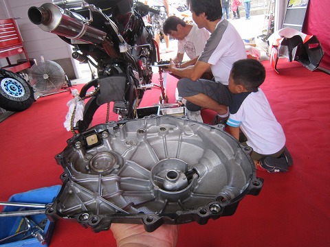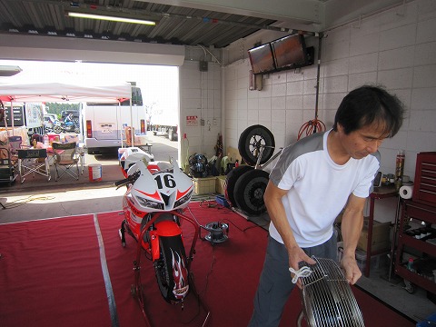 11:59 整備中 表ではピットウォークが行われていますが、ピットでは明日の決勝に向けてマシンの整備中。 そして、自分はいつもの液体パッキン剥がしの仕事が。 決勝前にクラッチを交換します。 と言うことで、まだお昼ですが、今日の予選のレポは終了です。 この後、整備をしたりカウルを準備したりして、結局ピットを後にするのは、いつもの様に暗くなってからでした。(笑) |