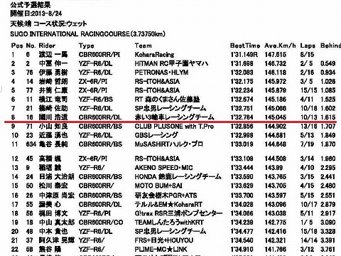 9:20〜10:00 予選 予選が終了しました。 バタバタしていて、予選中の写真を撮るヒマがありませんでした。(>_<) 國川選手は8番手で予選を終了しました。 予選のタイムアタック中、一度ピットイン、セッティングを変更して再度タイムアタック。 セッティングを変更したことが当たりだったようで、13周した予選の10周目にベストを出していますね。 タイムは1分32秒764でした。 予選時間の前半、路面コンディションが悪かったこともあり、予選時間の後半戦が勝負、2番手に付けた中富選手は5ラップ、4番手に付けた岩崎選手も5ラップしかしないで、タイムアタックをしてますね。 |