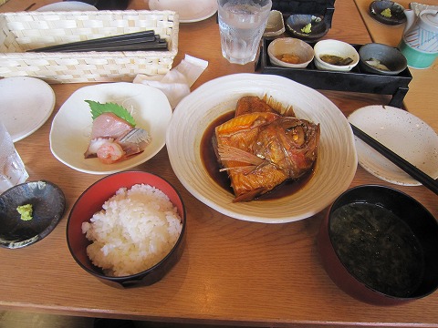 11:29 海鮮どんぶり しばらく待って最後に自分が頼んだ料理が出てきました。 頼んだのは、”金目煮付けと刺身三点盛膳”(¥2,200)。 伊豆と言えば”金目鯛”。 金目と言えば、大道は煮付け。 普段はあまり煮魚って好んで食べませんが、たまには、せっかくなので戴いてみることにしました。 前置きが長くなりましたが、『いただきます!』 (^o^)/ 金目は一匹ではなく、頭側とシッポ側のみ、中間部分の身の厚いところは、他の料理の刺身に回されているのかな。 そして三点盛りの刺身の内訳は、金目鯛、アジ、タコと甘エビとなぜか4点盛り。(笑) 金目とアジは地物だと思いますが、タコは? 甘エビは本州以北の日本海と太平洋側は宮城県以北に生息するので、地物でないことは間違いない。 四点盛りのお刺身は各一切れで、4点盛りと言うより、4切れ盛り。(-_-;) |