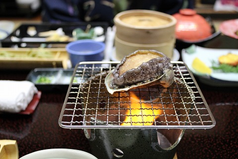 そして、アワビの地獄焼き(残酷焼き)。 去年、東伊豆を訪れたとき嫁さんはのたうち回るアワビを見て食べることができなかったが、今年は慣れてしっかり食べていました。 (^_^;) ”慣れる”って怖いね。 自分はあまりアワビが好きじゃない。と言うより高い金額払って食べるほどのもんじゃないと思っているので、一口食べて残りは嫁さんに。 |