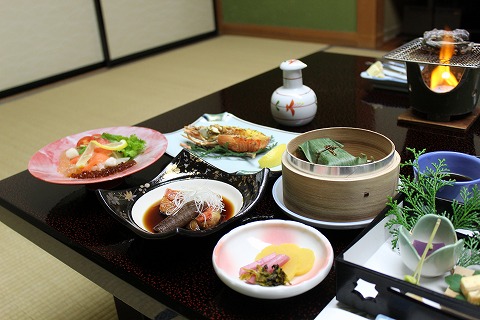 18:37 夕食 温泉から上がりビールを飲んでいると、6時半になり夕食の時間です。 夕食は当然のように西伊豆、駿河湾の海の幸を中心に造られた料理が並びます。 |