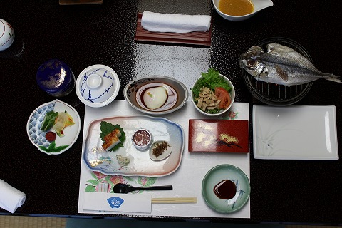 8:03 朝食 8時になって、朝食が運ばれて来ました。 今回は夕食・朝食とも部屋食です。 朝食は伊豆の名産アジの干物が付いた一般的な和食。 朝食の後は、温泉にひとっ風呂浴びに行きます。 |