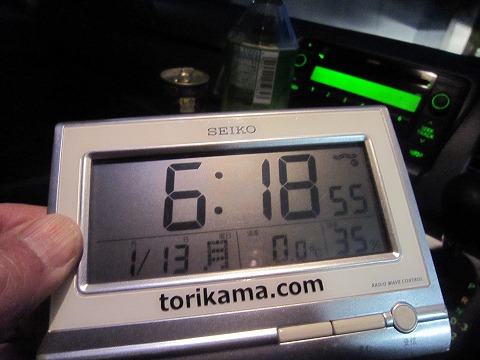 6:18 0.0℃ バイクや道具は昨日のうちに積み込みを完了していたので、後は出発するだけ。 ハイエースに乗り込み、ダッシュボードの上に置いてある電波時計に付属しいている温度計を見ると・・・。 ”0.0℃ (>_<)” 寒いはずだ。 ハンドルが冷え切って、手が冷たいね。 ハイエースはディーゼルエンジンで停まって暖機をしてもなかなか暖まらないので、出発することにします。 |