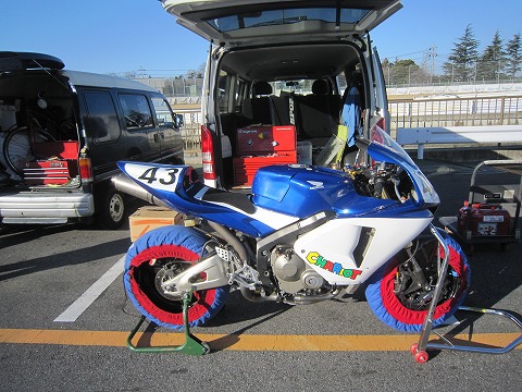 8:58 いの一番に パドックは一杯でしたが、1ヘアピン裏の駐車スペースは空いていたので、そこにハイエースを駐車。 さっそく走行の準備を始めます。 まずは”いの一番”にタイヤウォーマー。 この時期はタイヤの暖まりが悪いので、2時間はしっかり暖めたいところ。 エアー圧をチェックしたら、タイヤを暖めておきます。 |
