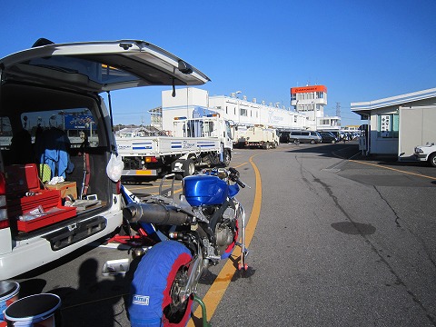 9:36 冬空 暖機が終わり走行できるのが確認できたら走行券を買いにコントロールタワー下へ、そしてガソリンを購入しにスタンドへ。 今日の空は青が深い、すっかり冬空だね。 9時半の時点で気温5.2℃、路面温度は4.2℃だ。 そして、今日は10m近い強い風が吹いているので、路面温度もあんまり上がらないかな。 |