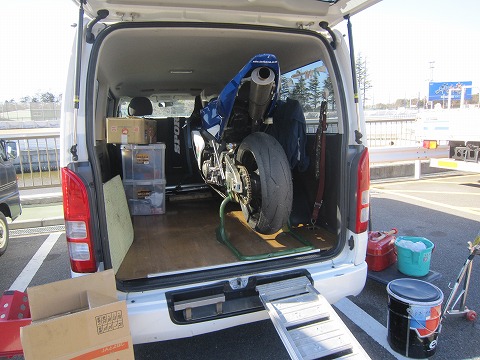 12:31 積み込みちう 走行が終わったバイクは、また冷却水を抜いてバッテリーを取り外し、冬眠仕様へ。 そして積み込み。 |