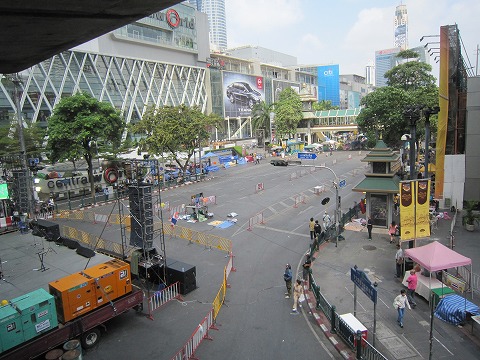 11:42 Central World チットロムからSiamに向け歩いていると、右手にショッピングセンターCentral Worldが見えてきます。 そして、いつもは渋滞のクルマで埋め尽くされているその前の通りはデモの会場としてクルマの乗り入れは禁止、集会場の広いスペースができています。 ここが今回のバンコクのデモンストレーションの中心部だそうです。 大きなステージと足場に吊されたスピーカーが野外コンサート会場の様です。 |