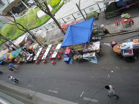 11:43 出店が並ぶ そしてBTSの高架下もクルマの進入が禁止。 長期化したデモの参加者の生活のために路上には日用品を売る出店が並んでいます。 |