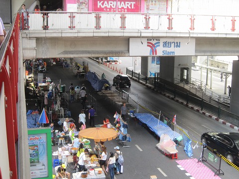 11:52 Siamに到着 一駅歩いてSiam駅に到着。 やっぱりここも片側が車両進入禁止になっていて出店が並んでいます。 ぱっと見の風景は、どう見てもお祭り。 そして歩いている人も、普通に欧米人もいるし普段の様相です。 ※ それでも、この日先ほどのデモの会場で、警官隊とデモ隊の衝突がありデモ隊の人が死んでいます。 |