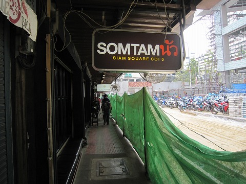 11:57 昼食は そして到着した先は、Siam square soi 5にある”SOMTAM”。 以前も訪れたことがありますが、再訪。 店の名前のとおり、ソムタムをメインに食べさせてくれるお店です。 現在右手部分は空き地になっていますが、以前は雑居ビルが建っていました。 今は立替中。 今度来たときには、どんなビルが建っているんでしょうね。 ちょうどお昼の時間になりました。 さっそく、入店します。 |