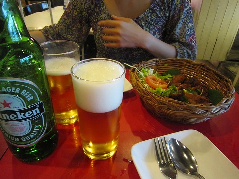 12:05 まずはビールで 暑い中歩いてきたので、まずは水分補給。 昼間っから、まずはビール。 平日の昼間、他の人が仕事をしているときに呑むビール、ちょびっとだけ背徳感があって旨いんだなぁ。(笑) singha beerは嫁さんに禁止されているので、今日はタイでメジャーなHineken。 タイで広く売られているhinekenはオランダではなくタイで作られてます。 ちょっと甘みが強いかな。 これはタイ産の特徴? 最近はオランダ産のhinekenを飲んだ記憶がないので、味の違いはわからないけどね。 |