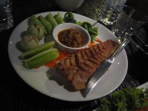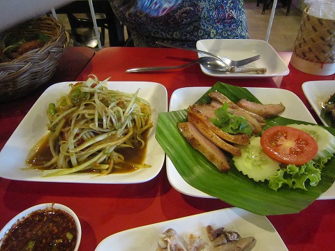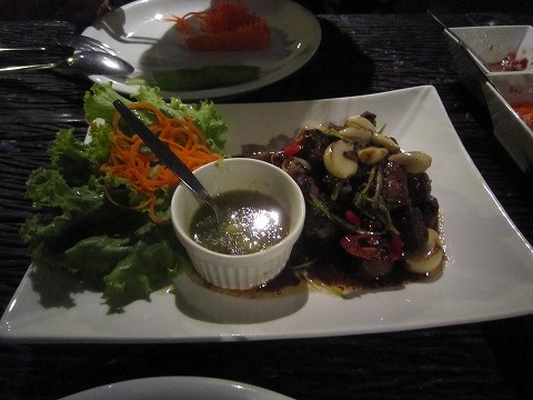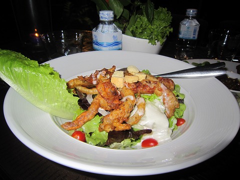 21:17 最終日 えーっと、何だったかな? 忘れちゃった。 たぶんシーフードサラダか何か。 書いていたらだんだん思い出してきたけど。 上に載ったシーフードのフリッターみたいなのが、甘くて油が強くて結構ヘビー、だったね(笑)。 今回のタイ滞在も実質今日がラスト。 最後の晩餐です。 明朝早くに帰国の途に付きます。 |