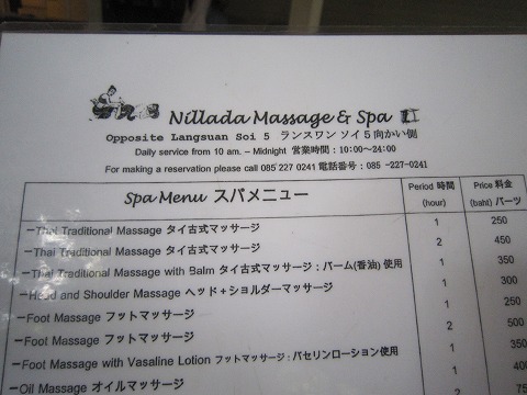 13:14 安い 2010年の11月にタイに来たときも訪れた店ですね。 そのときはなかったメニューに日本語版が出来ていました。 2010年のときは2時間で500バーツでしたが、今は450バーツ。 値下がりしたのかな。 450バーツ→約\1,400と安いね。 バンコクでも、外国人向けにやっているとことは、結構高かったりします。 |