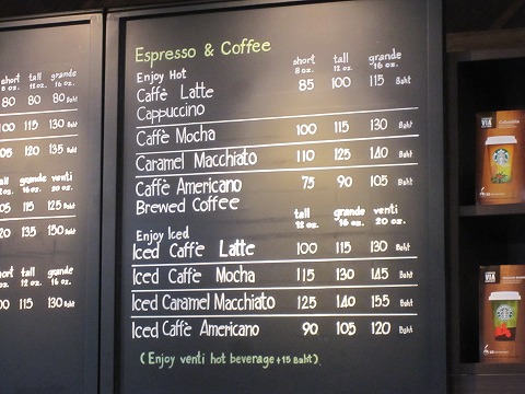 15:35 スタバに マッサージの後、喉が渇いたので冷たい飲物を飲みに。 入ったのは、通りがかりにあったスターバックス。 タイバーツは日本円の約3倍強なので、書いてある金額を3倍するとだいたいの日本円になります。 アイスカフェラテのトールサイズが115バーツなので¥350円。 と、ほとんど値段は変わらない、安くないよね。 (自分は日本ではまずスターバックスに入らないので、ちゃんとした値段はしりませんが。) |
