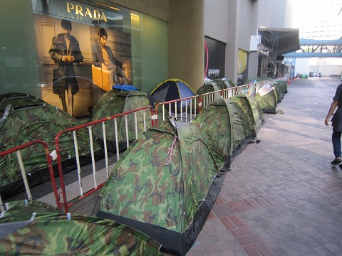 16:33 泊まり込み お茶をしたあと、午前中に通ったデモの中心地Central Worldへ。 Central Worldのまわりにはデモ隊の泊まり込み用のテントがずらっと並んでいます。 外はこんな雰囲気ですが、ショッピングモールは普通に営業しています。 |