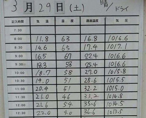 8:10 走行15分前 バイクのところに戻って来て、ガソリンを給油。 今日は土曜日なので1枠20分の走行です。 なので、周回数は20÷1分×9割=18周くらい。 1リットルで3周以上できるので、18÷3=6リットル。 暖機前、タンクに前回の残りが1.5リットル残っていたので、そのまま6リットル追加して合計7.5リットル弱で走り始めます。 今日1本目はA1で8時25分から、あと15分ほどで開始です。 予約のときに、速いほうのB枠も空いていたんですが、METZELERが初乗りと言うのを自分の言い訳にして、実際は乗れていないのと、シーズンはじめなので遅い方のA枠に予約を入れました。 (-_-;) 走行前にタイヤのエアー圧をチェック。 フロント、リヤとも220Nまで上がっていたので、エアーを少し抜いて200Nで走り始めます。 それでは走行の準備が出来たので着替えることにします。 |
