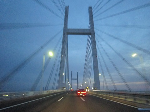 5:16 ベイブリッジを通過 自宅を出発する時間が予定より遅くなったこともあり、ETCの休日割引も適用になるので横須賀インターから横浜横須賀道路に上がり、幸浦から首都高速湾岸線に接続、横浜ベイブリッジを通過。 日の出前で、少しだけ空が明るくなってきました。-;) |