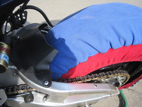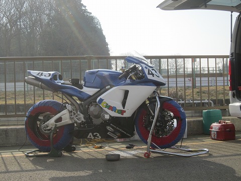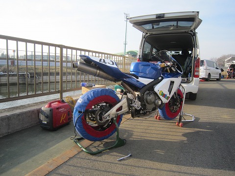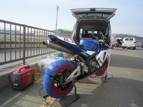 7:03 取り急ぎ 今日、1本目の走行はA1で8時25分から。 走行まで1時間半を切っているので、取り急ぎハイエースからマシンを降ろしたら、タイヤのエアー圧を確認して、タイヤウォーマーをかけます。 そして今回初めて走るMETZELERのタイヤのエアー圧を聞いてくるのを忘れちゃったので (>_<)、まずは冷間で前後とも180Nから初めてみます。 |