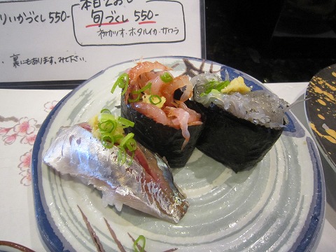 静岡県の名産、桜エビ、生しらすの軍艦とアジの握り。