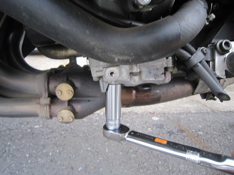 15:34 ドレンを取付け オイルを抜き終わったら、ドレンボルトをトルクレンチを使って締め付け。 |