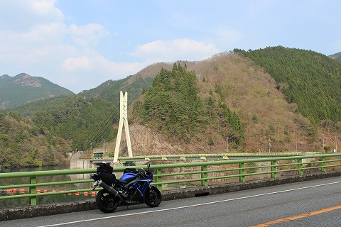 15:23 カラウコ大橋 山崎インターから国道29号線を30kmあまり走ると左手にダム湖が見えてきます。 このダム湖の名前は音水湖(おんずいこ)、引原ダムによって作られた湖です。 この湖に架かっている橋が後ろに写っているカラウコ大橋。 吊り橋ですが、橋塔が1つしかなく、片側だけで吊っている珍しい形の橋です。 別に橋マニアじゃありませんが、ここで写真を一枚。 ここまで来ると、走っているクルマはほとんどなく、貸切状態です。 「いやぁ〜。この路線はツーリングにはイイ!」 |