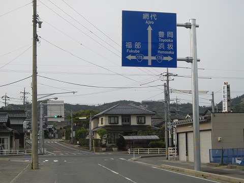 16:50 浜坂の 退屈な鳥取の市街地を抜け、国道9号線から脇道へ。 道路標識に”浜坂”の地名が出てきました。 ここで右折して、日本海の海沿いを走る国道178号線に入り浜坂を目指します。 |